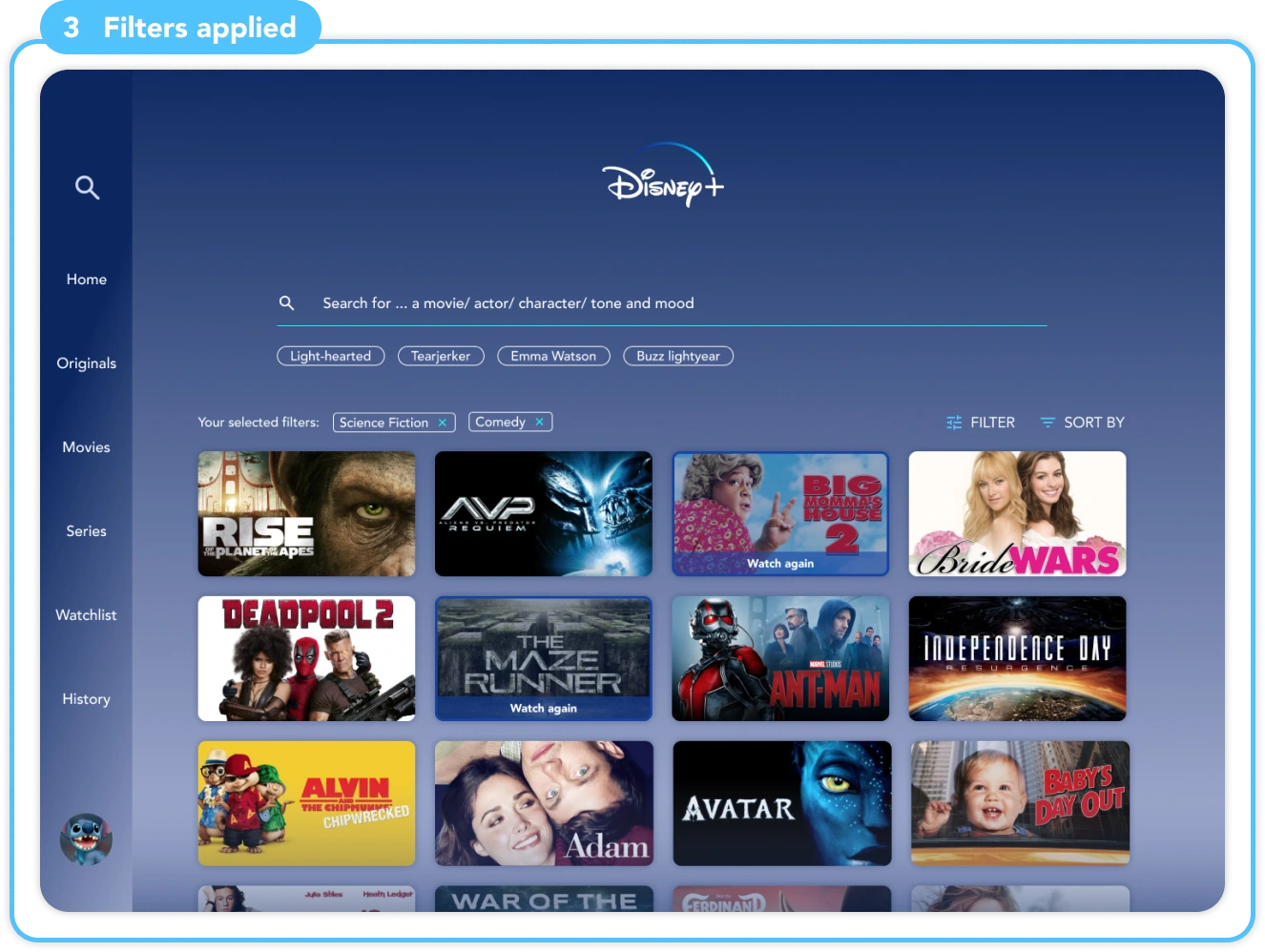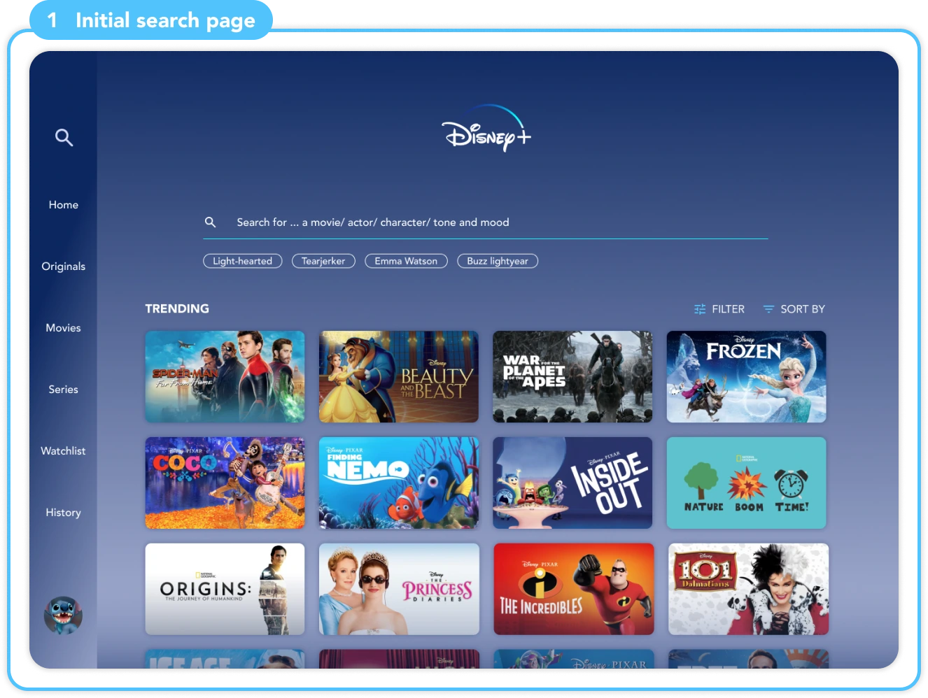 The ‘Continue watching’ row should be prioritised first so users can easily see where they left off previously. ‘Recommended for you’ / ‘New to Disney’ / ‘Because you watched ____’ can then come after. I’ve removed all the genres that are currently listed on the homepage as it can be too cluttered and unnecessary since users can easily access them on the movies/ series page or simply run a search.