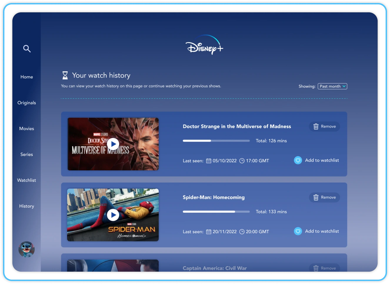 It was mentioned that having a watch history page would be useful as it was sometimes challenging to find the continue watching section on the homepage as it’s not always fixed on the top of the rows. Having a history page lets users quickly access what they last watched and when they watched it etc.